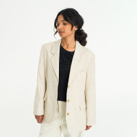 Women beige linen blazer with notched lapel, single-breasted 3-button closure, and flap pockets for versatile layering.